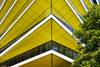 The building is identifiable by its horizontal white glass spandrel panels around the building and its prominent yellow glass soffit balconies located at opposing corners to the south-west and north-east of the building.